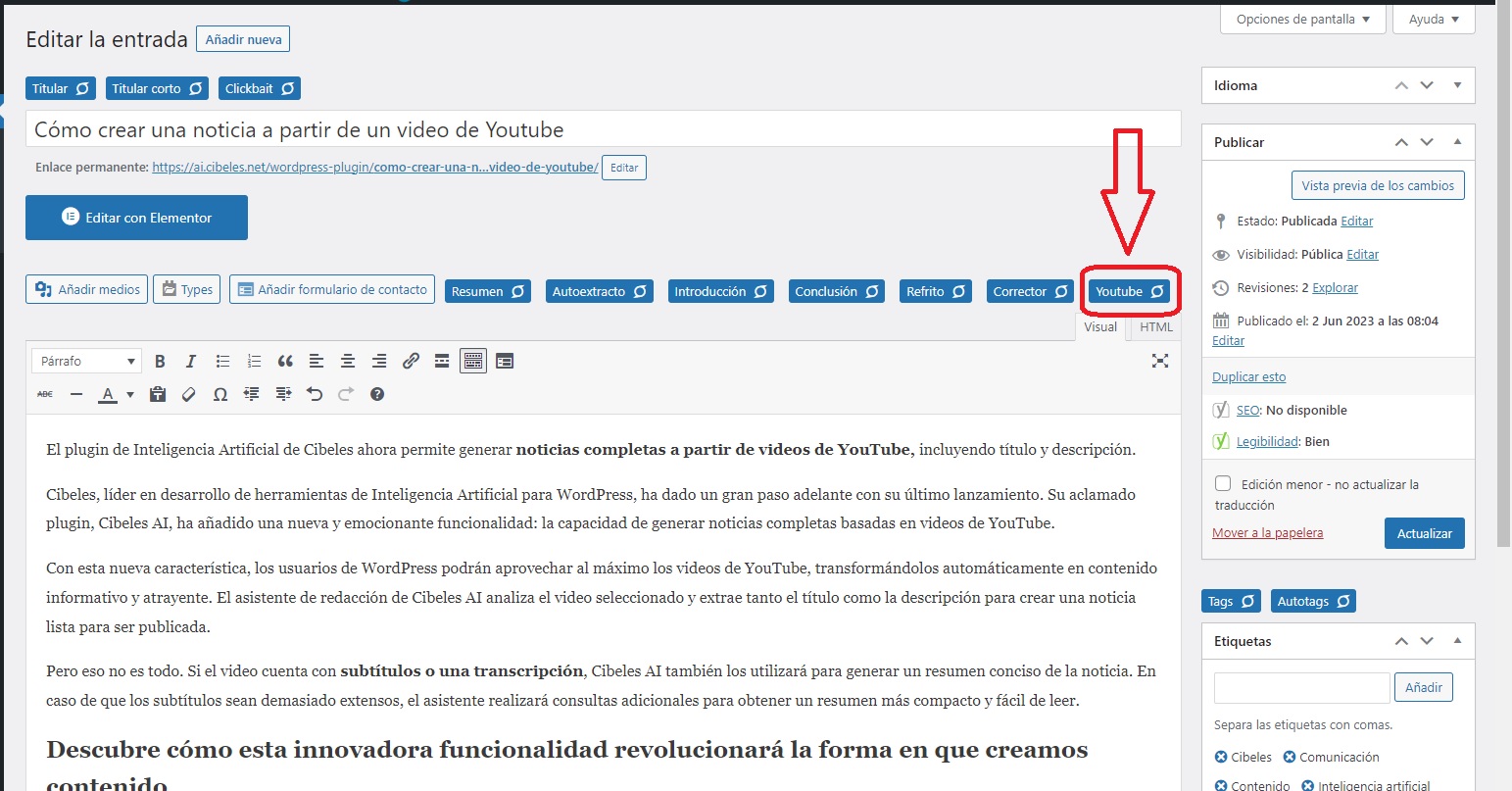 Le plugin Cibeles AI vous permet désormais de générer des articles d’actualité complets à partir de vidéos YouTube, y compris le titre et la description.