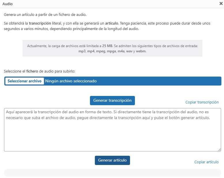 Il sistema incluso nel plugin gratuito Cibeles AI incorpora un nuovo pulsante la cui funzionalità consente all’editor di caricare un file audio con estensione mp3, mp4, mpeg, mpga, m4a, wav o webm e di generare una trascrizione letterale del testo, grazie al modello Whisper di OpenAI.
